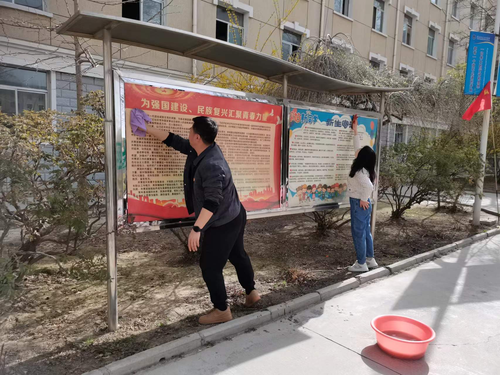 根据学院“我为学院做一件好事”的倡议,4月15日下午,人文科学与社会科学教学部党支部组织全体党员开展了清洁校园宣传栏活动。