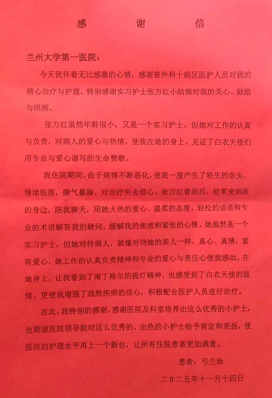张万红:专业融通,以温情服务赢赞誉3.jpg       张万红同学在实习中,展现出全面的综合素质。她能够精准掌握普外科护理、内分泌专科护理及康复训练等核心操作,严格遵循流程与无菌原则。在与患者及家属沟通时,她始终耐心细致、语言温和,有效缓解患者焦虑,赢得了患者李湘元及家属的专门致谢:“输液时的轻柔操作、耐心讲解,还有那句‘别担心,会好起来的’,让我们倍感温暖。”张万红善于将理论融入实践,积极向带教老师请教,团队协作意识强,成长迅速,因其出色的表现和积极的学习态度,受到科室带教老师的肯定。4.jpg       值得关注的是,两名同学均按照医院护理培训体系,先后在普外科、内分泌科、康复科等不同科室轮转实习,目前均在普外科十病区继续完成后续实习。在不同专科环境的系统锻炼中,她们展现出良好的适应能力与持续的学习成长性,也反映了我院护理人才培养的全面性与系统性。